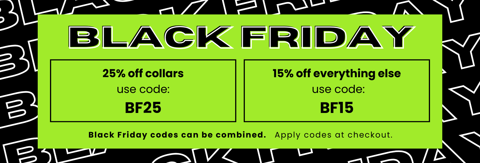 Use code BF25 for 25% off collars & BF15 for 15% off everything else (even apparel)!