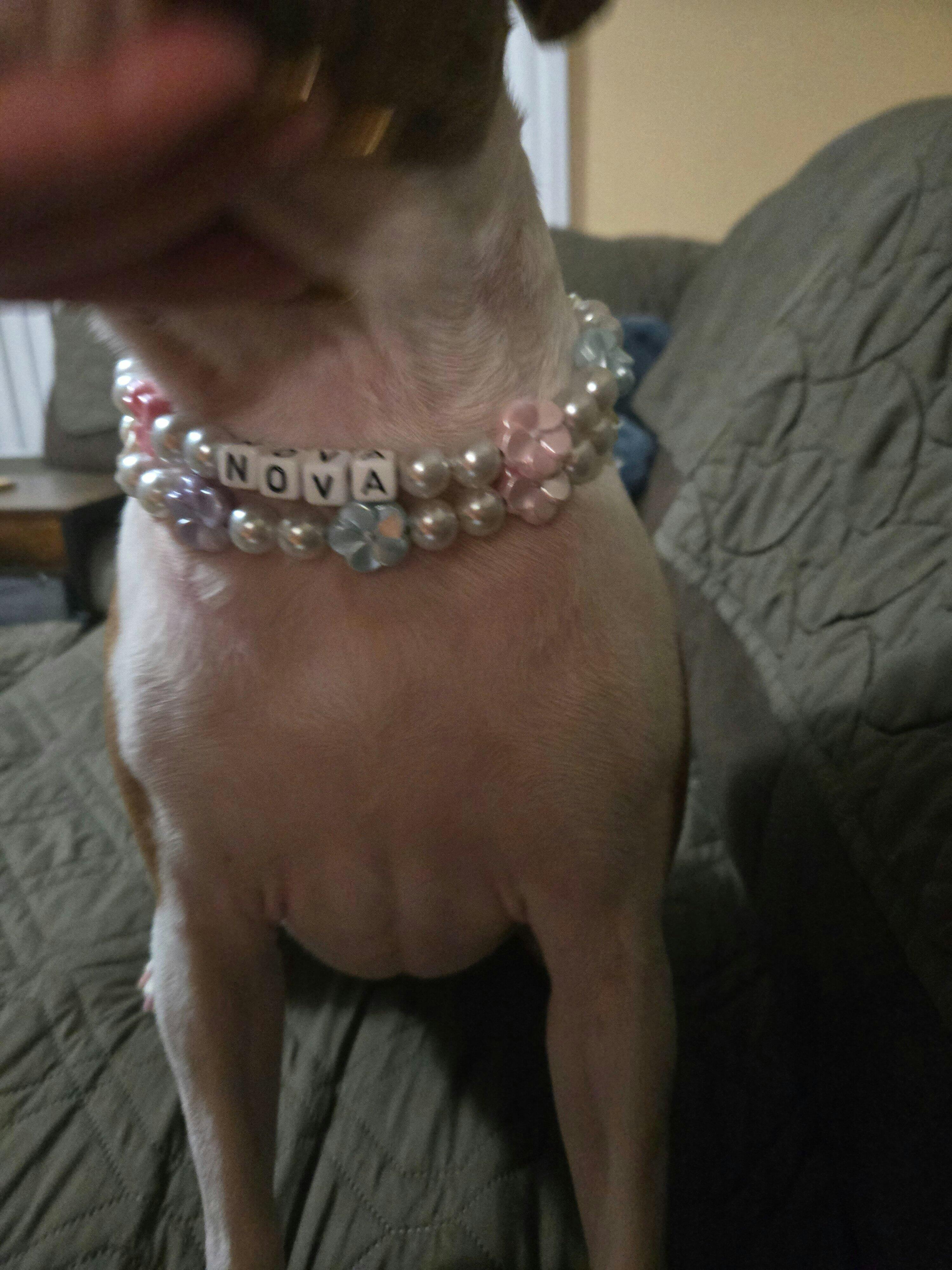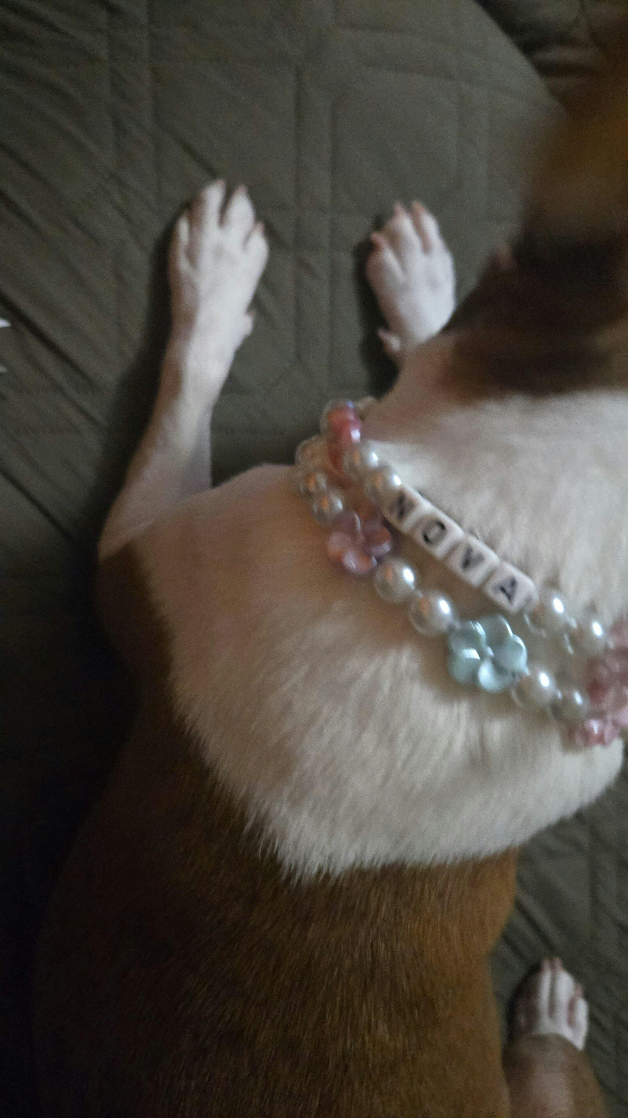 Based on the size of the collar some beads may be removed or added to keep the collar aesthetically pleasing and balanced. Please note due to the bead size this collar is each strand in strung through lighter weight stainless steel cable (270 lb. tensile strength) and may note be suitable to attach a leash for larger dogs.